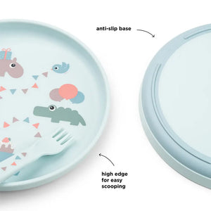Material: Plato: 100% PP de grado alimenticio con antideslizante TPE. Cubertería: 100% PP de grado alimenticio. Vaso: Tritán.