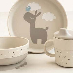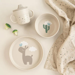El set en tonos arena tiene un bonito print. El plato tiene un motivo de Lalee y Birdee, y el bowl lleva a Birdee en un cactus, con confeti decorando el bowl y la taza con dos asas. Los detalles en tonos más oscuros en arena le dan un toque en dos colores muy bonito.