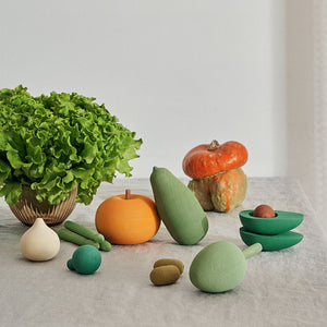 - El set contiene 11 piezas:1 palta con cuesco, 3 espárragos, 2 papas, 1 alcachofa,  1 champiñón, 1 nabo, 1 berenjena y 1 zapallo amarillo.