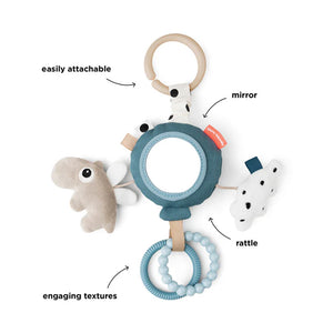 El bebé puede agarrar y sujetar fácilmente las anillas y el espejo. Usa el eslabón para engancharlo al cochecito, asiento del coche o la almohada para el tiempo de juego boca abajo.