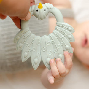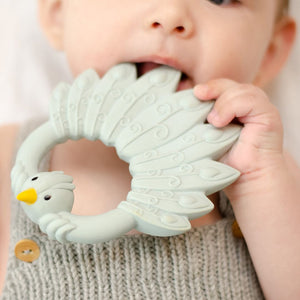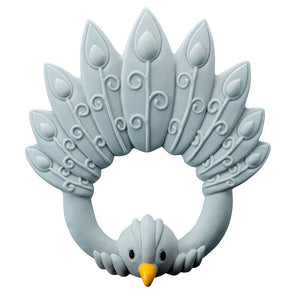 Este precioso anillo mordedor Pavo celeste, de Natruba, está diseñado para ayudar con las molestias de la dentición al mismo tiempo que fomenta el juego sensorial y la entretención.