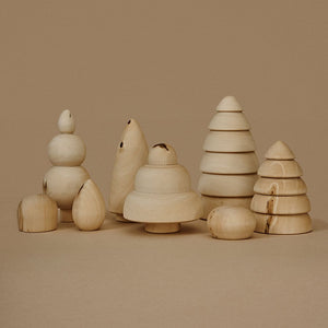 - El set contiene 8 piezas: 5 árboles de madera y 3 arbustos.