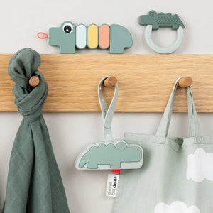 El porta chupetes de silicona Croco, en tonos verdes, tiene capacidad para 2 o 3 chupetes. Con una correa ajustable, es fácil de sujetar al cochecito o al bolso cambiador, asegurando que los chupetes de tu bebé se mantengan limpios, accesibles y siempre a mano.