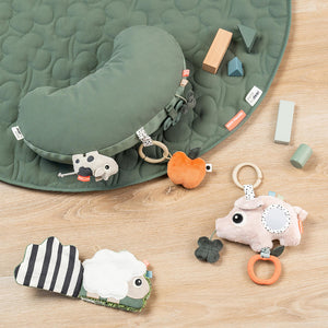 Este juguete de actividades sensoriales está lleno de funciones emocionantes para estimular los sentidos de tu bebé. Incluye un sonajero, un timbre y un crujido que fomentan la audición y el tacto, mientras que el espejo invita a tu pequeño a descubrirse a sí mismo. Tirar del mordedor en forma de manzana activa un divertido movimiento, añadiendo un extra de alegría a la hora de jugar.