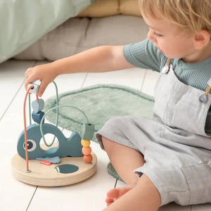 Con el laberinto de cuentas de madera de Wally, tu hijo puede practicar la motricidad fina y el agarre de pinza mientras mueve las pequeñas cuentas y los peces de un extremo al otro. La ballena y los elementos del mar inspiran a tu pequeño a sentir curiosidad por la vida bajo el agua.