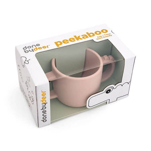 ¡Peekaboo es hora de tomar agua!  Croco se asoma desde el fondo de la taza de silicona para ayudar a los niños a tomar sus primeros sorbos.  La taza de dos asas tiene el tamaño y el peso perfecto para que los más pequeños la sostengan fácilmente.
